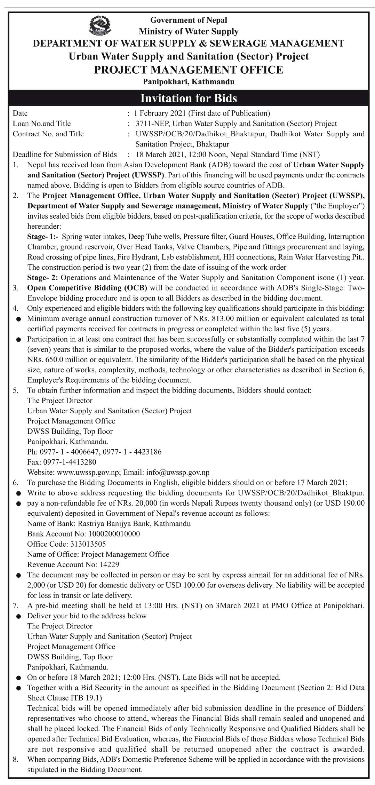 Invitation for Bid for UWSSP/OCB/20/Dhadhikot_Bhaktapur Water Supply and Sanitation Project (Published on The Kathmandu Post National Daily)