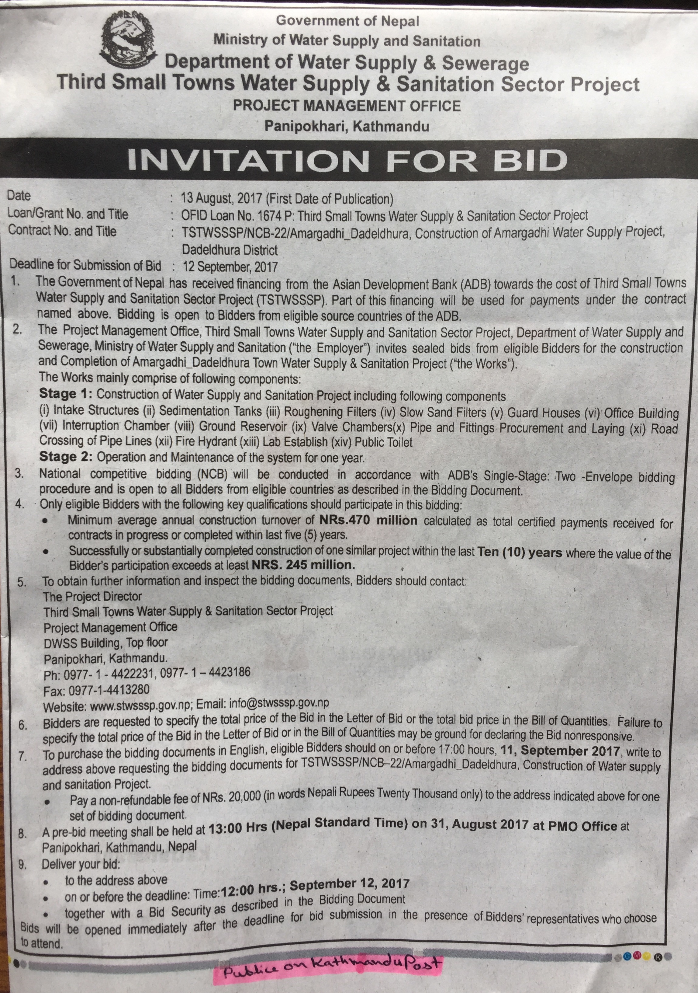 Invitation for Bid of Amargadhi , Dadeldhura (Publish on Kathmandu Post)