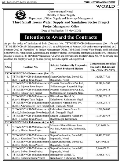 Notice of Intention to Award the Contracts (Published on Kathmandu Post)