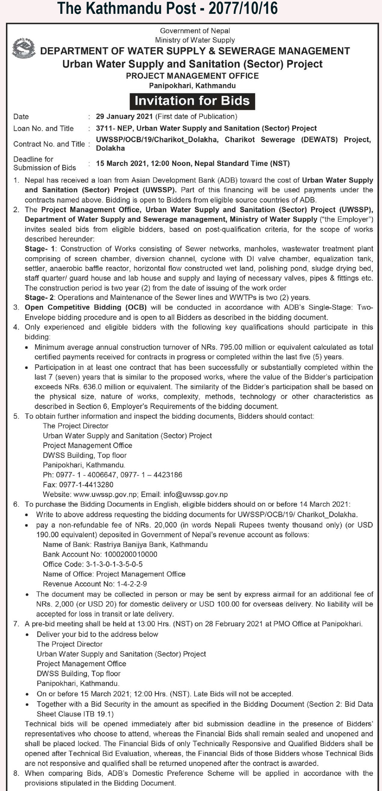 Invitation for Bid for UWSSP/OCB/19/Charikot_Dolakha, Charikot Sewerage (DEWATS) Project, Dolakha (Published on The Kathmandu Post National Daily)
