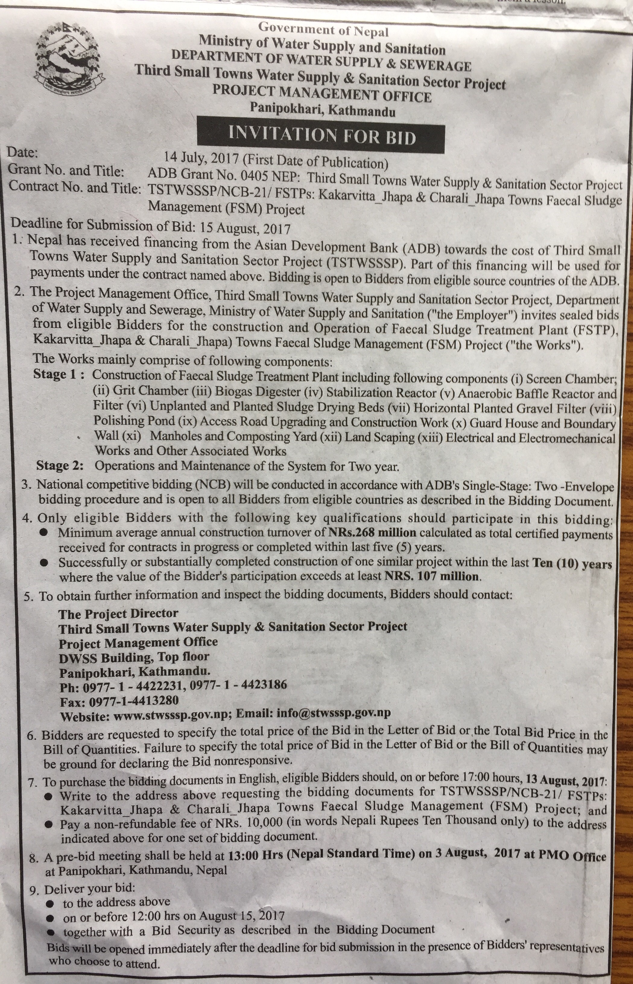 Invitation for Bid of Kakarvitta & Charali, Jhapa (Publish on Kathamndu Post)