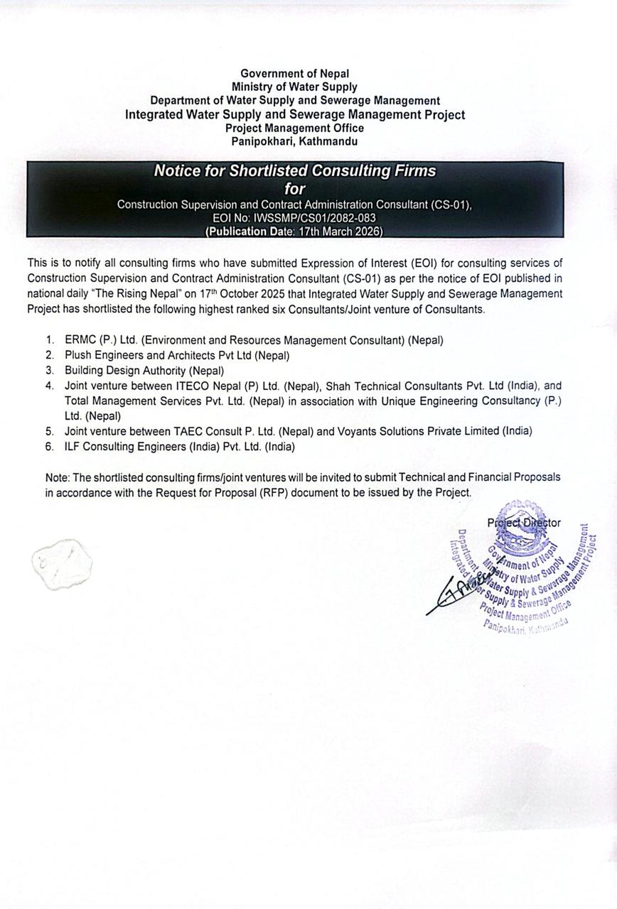 Notice to Intent to Award Contract (Ref.-UWSSP/OCB-33/Enhancement of Ilam Water Supply and Sanitation Project, Ilam